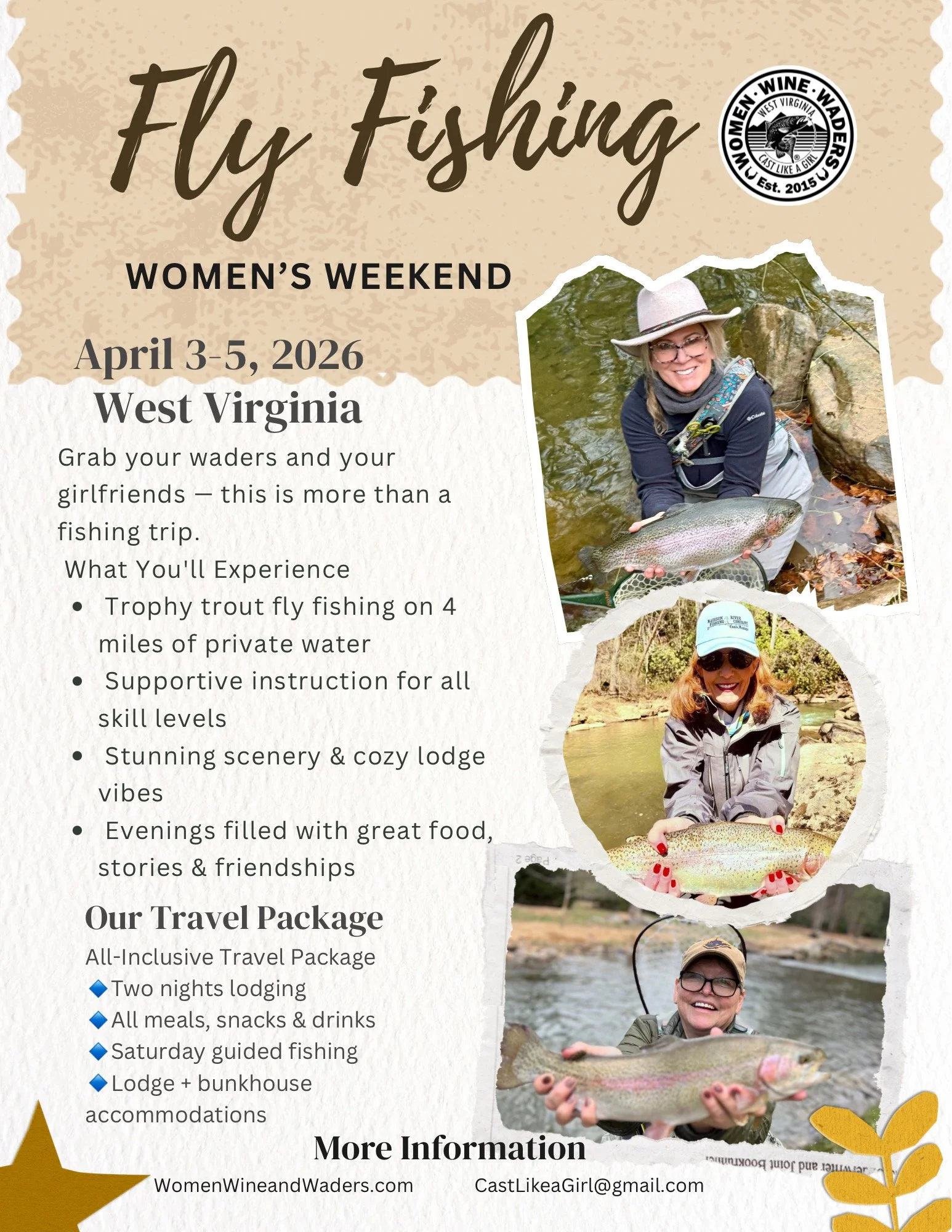 Second Creek - Monroe County, WV Friday-Sunday April 3-5, 2026 Grab your waders and your girlfriends-this is more than a fishing trip. It’s laughter, confidence, connection, and landing beautiful trophy trout. Whether you’re brand new or seasoned, this weekend is designed for women who want adventure without pressure.